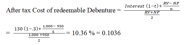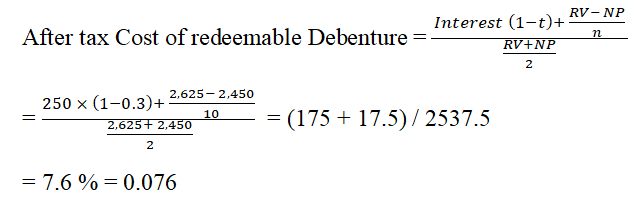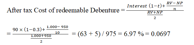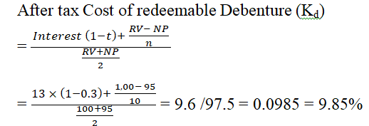 Cost of debt (Kd) = Interest rate × (1 – t) = .1 ×.7 = .07 = 7 %