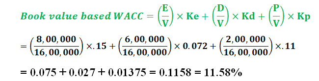 Total | 20,00,000 | WACC based on Book Value = ∑ Weighted Cost = 0.092 + 0.024 + 0.018 = 0.116 = 11.6 % |
